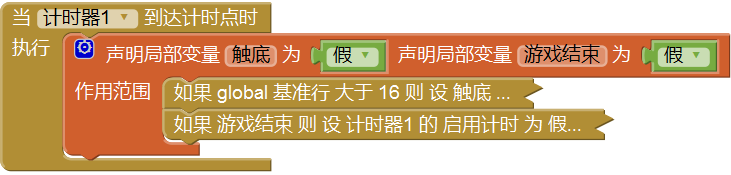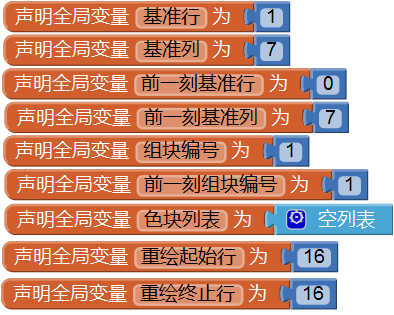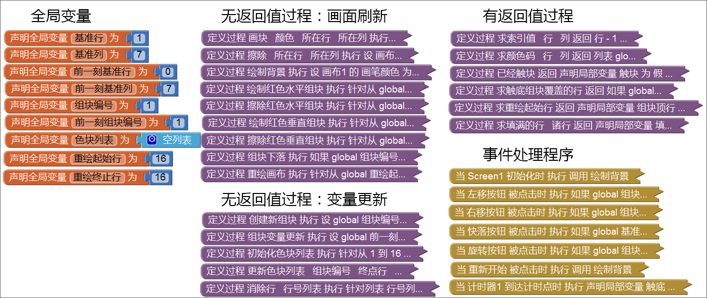 结构块与复用块不同的是,它们的存在不是为了提高代码的复用性,而是为了满足一种结构性的需求。图中有八个这样的块:组块下落、组块变量更新、已经触块、消除行、求触底组块覆盖的行、求重绘起始行、重绘画布以及更新色块列表,我们注意到它们都是由计时程序直接调用的块。还记得组块下落、组块变量更新这两个过程的来历吗?回顾一下第10章的图10-7、10-8及10-9,我们直接把原来计时程序中的代码拖到两个新定义的过程里,反过来再在计时程序中调用它们。这样做的目的并不是为了让其他程序也可以调用它们,或者说提高代码的复用性,而仅仅是为了让计时程序显得不那么冗长而已。其他几个结构块的作用也是如此,我们完全可以将这些过程里的代码直接写在计时程序中。