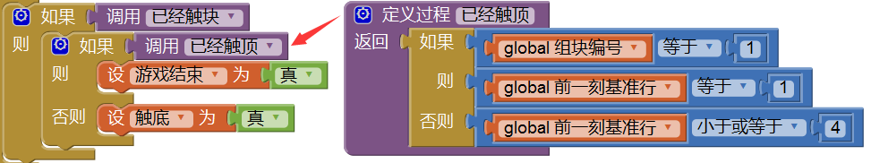 这里我们对其进行改进。方法是创建一个有返回值的过程,取名为已经触顶,将触顶判断封装起来。然后在主程序中调用已经触顶过程。如图11-11所示。