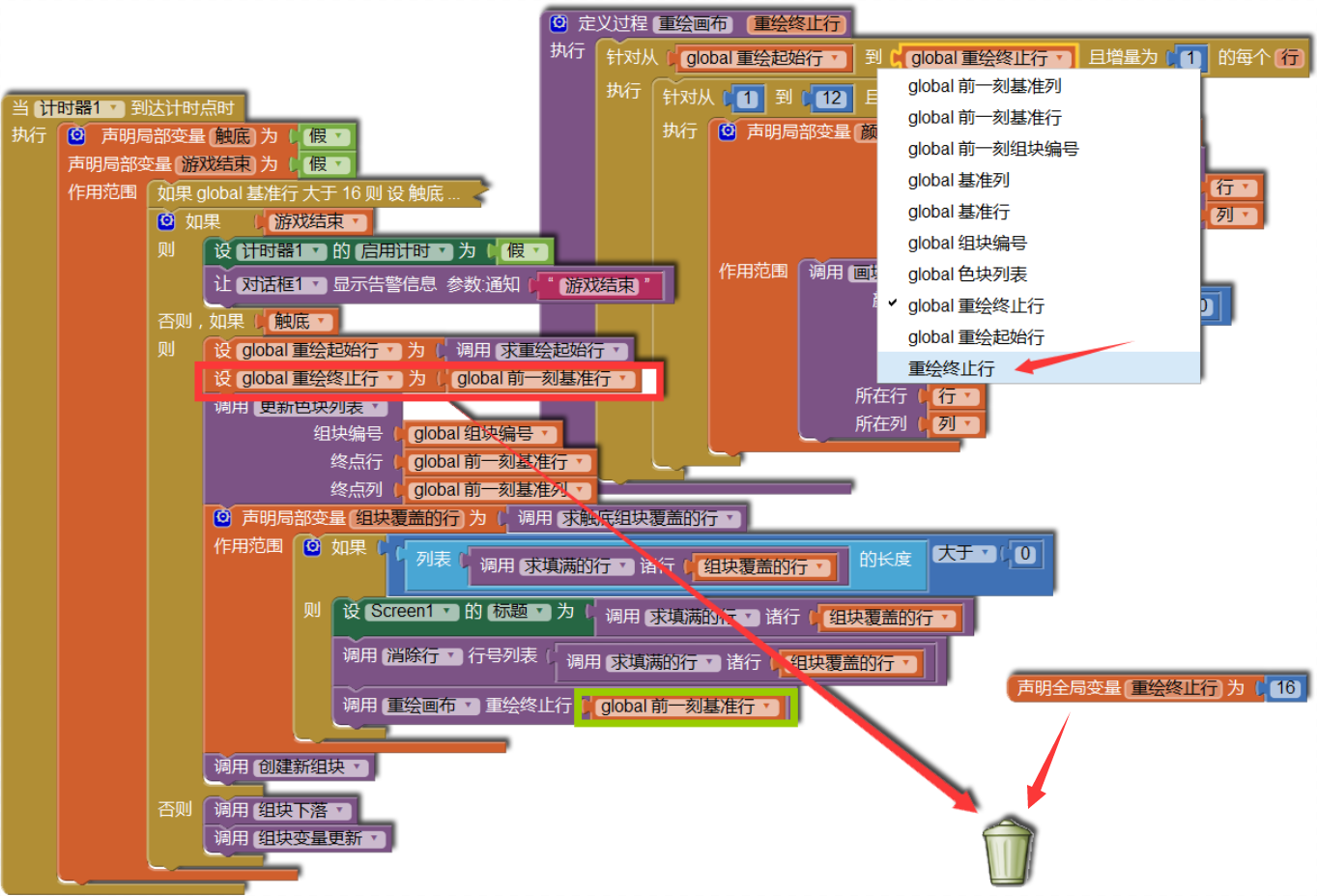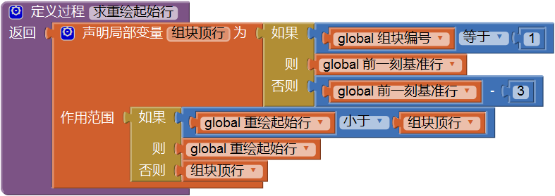 我们对代码稍作处理,如图11-5所示,为“重绘画布”过程添加一个输入参数“重绘终止行”,将循环变量的终止值有原来的“global 重绘终止行”改为参数“重绘终止行”;在计时事件处理程序中,让“重绘画布”直接引用“global前一刻基准行”,来代替原来的“设global重绘终止行为global前一刻基准行”;最后,删除全局变量“重绘终止行”。