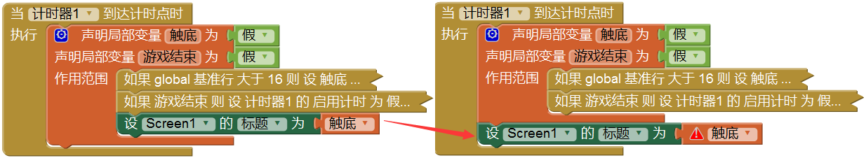 与全局变量对应的是局部变量,我们在前面的程序中使用了许多局部变量。局部变量只在有限的范围内有效,如图11-2所示,在过程或事件处理程序中的局部变量只在声明局部变量的橙色代码块内部有效,当橙色代码块执行完毕后,局部变量将不复存在,变量也无法再被访问,此时,用于存储该变量的内存空间已经被释放。在图11-3中,我们将“设置屏幕标题为‘触底’”一行代码从声明局部变量的橙色方块中拖出,放到橙色方块之外,此时,“触底”块的左侧出现一个红色三角形的警告标志,表明这个代码是错误代码。