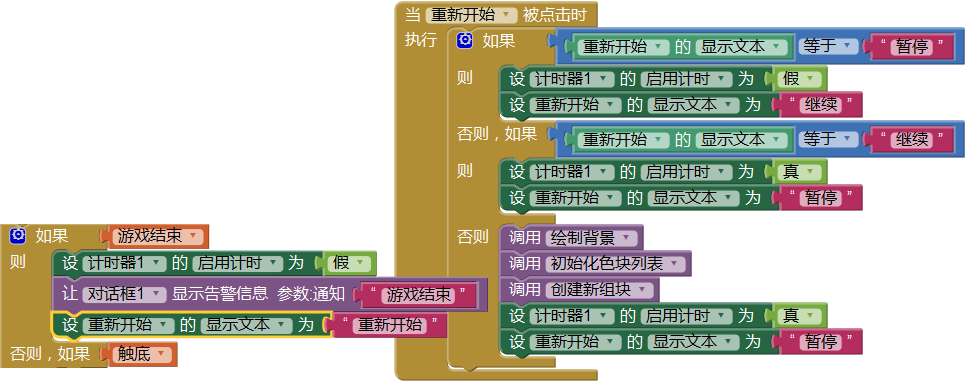 我们仍然沿用这个按钮原来的名字(重新开始),下面我们编写代码来实现上述功能。通过读取按钮上的文字,来判断程序当前的运行状态,从而决定执行不同的操作。如图11-7所示。首先,让按钮的默认显示文字为“暂停”,然后修改计时事件处理程序,当游戏结束时,设置按钮的显示文本为“重新开始”,如左图;再来编写按钮点击事件处理程序,如右图。程序经过测试,实现了预期效果。