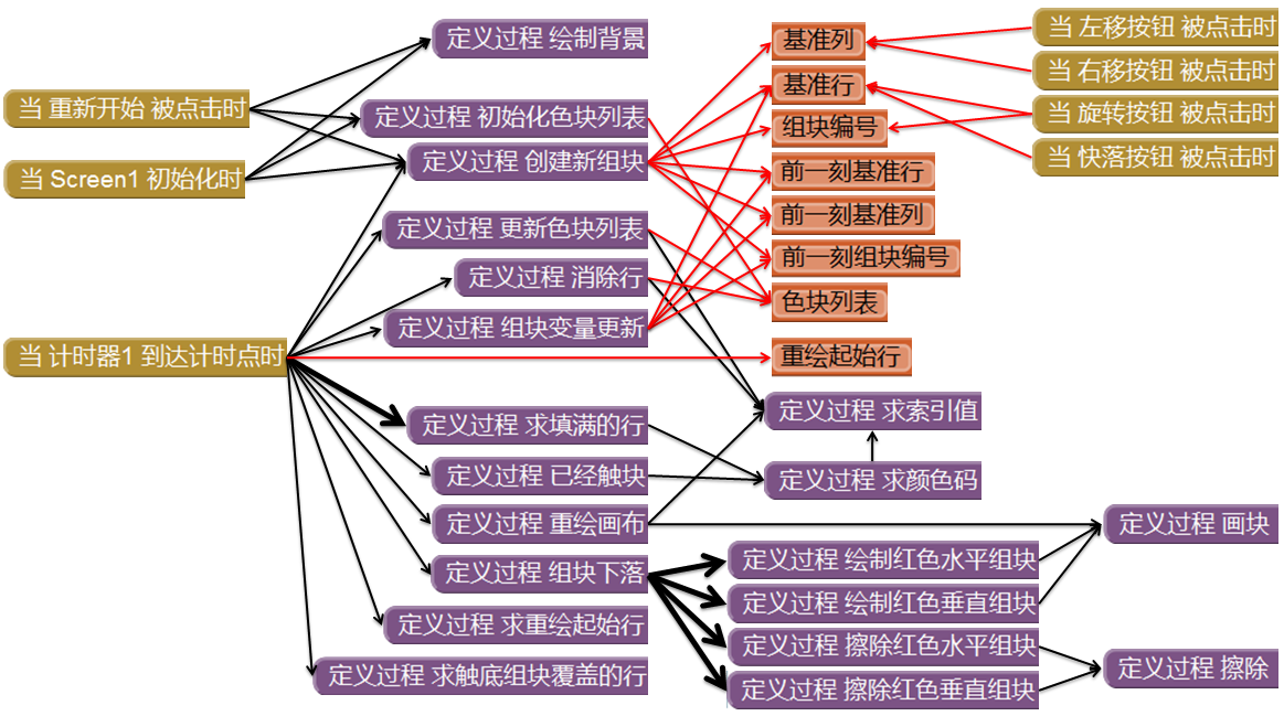 图中最显眼的莫过于计时事件处理程序,众多的线条以它为起点向外辐射;那些紫色的过程方块,分层部署在它的右侧;全局变量夹在过程与事件处理程序之间,另外几个事件处理程序与少数过程及全局变量保持着简单的联系。这就是我们程序的全貌。不过我们本节的重点不是描绘整个程序,而是那些紫色的过程。