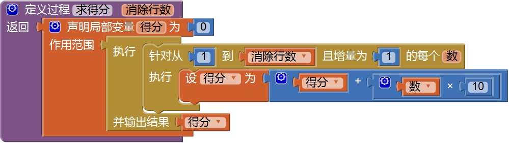 你能想到如何用代码来实现这个计算吗? 没错,就是用循环语句。我们定义一个带参数并且有返回值的过程,如图12-1所示。输入一次性消除的行数,返回本次消除行的得分。