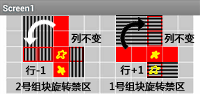 对于1、2号组块而言,这里所说的旋转,并非一般意义上的连续的顺时针或逆时针旋转,而是在两种状态之间切换,切换的路径就构成了旋转禁区,如图12-10所示,其中1号组块的旋转禁区包含8个方块,它们的坐标是: