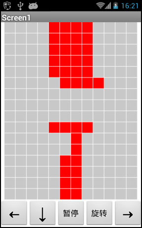 下一步改写旋转程序,结果如图12-14所示。首先判断左右及底部边界是否会成为旋转的障碍,如果旋转不会触及边界,再判断旋转是否会触及禁区。如果组块在当前位置的旋转既不会触及边界,也不会触及禁区,则执行旋转操作。