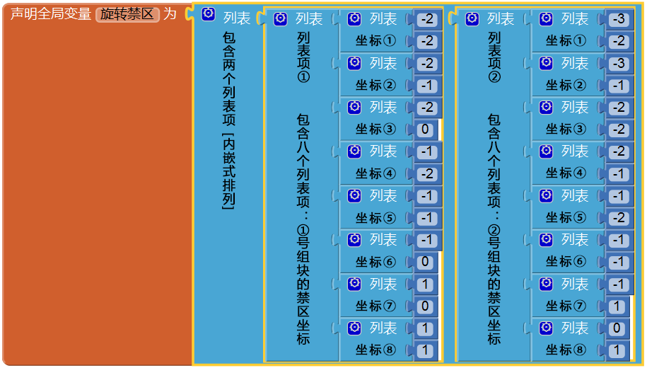 我们为这些旋转禁区建立一个列表,并在旋转程序中访问这个列表中的相关列表项,从而判断旋转动作是否可以执行。这是一个三层列表,第一层19个元素,对应于19种组块;第二层与旋转禁区中方块的个数有关,对1、2号组块而言,均包含8个元素;第三层是坐标值,包含两个元素:行、列。目前列表的第一层只有两个元素,如图12-12所示。这里我们忽略了对基准行、基准列的引用,在程序中将引用组块的当前行及当前列,来确定具体的禁区坐标。