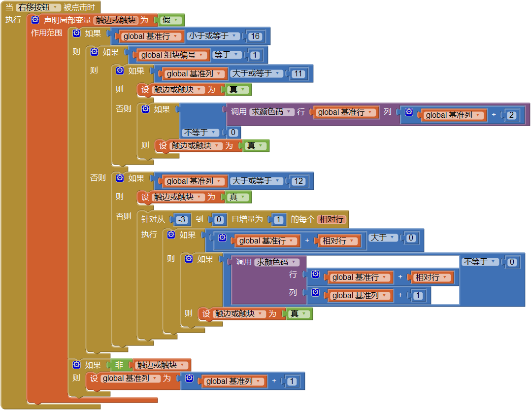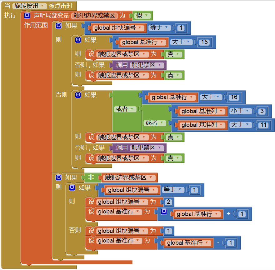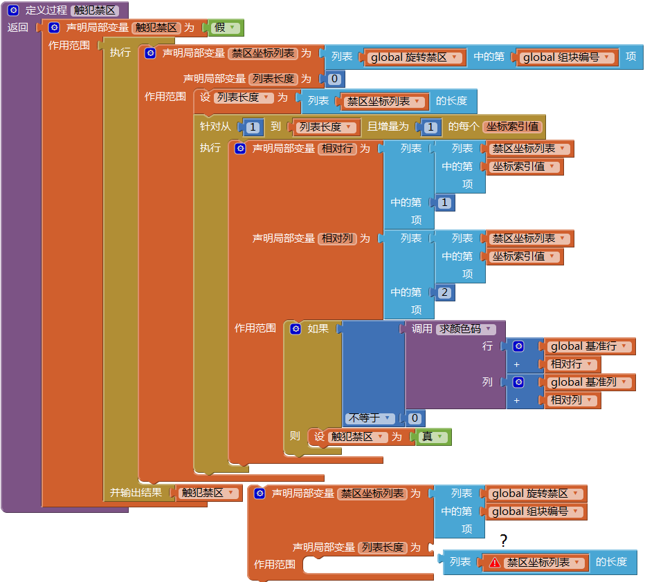 首先定义一个有返回值的触犯禁区过程:根据组块编号及当前行、当前列信息,对现有组块在旋转时是否会触犯禁区作出判断,如图12-13所示。这段程序利用了旋转禁区列表,如上所述,这是一个三层列表,通过组块编号来确定被访问的第一层列表项的索引值,得到临时变量禁区坐标列表;通过对禁区坐标列表求列表长度,得到临时变量列表长度,并执行循环语句“针对从1到‘列表长度’且增量为1的每个‘坐标索引值’,执行...”,求每一组坐标所对应的颜色码。只要其中有一组坐标对应的颜色码≠0,则“触犯禁区=真”,因此将无法实施旋转操作。这里遗留一个问题:为什么临时变量禁区坐标列表与列表长度不能在一个临时变量块中同时设置声明呢?如图12-13右下角的那个块。读者可以自己试试看,同时声明设置会有什么问题,我们会在第14章中解释这个问题。