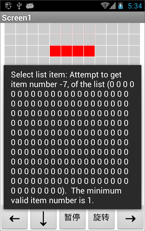 在用手机进行测试时,出现了运行故障,如图12-15所示,故障的原因是“访问了索引值<0的列表项”,这样的错误在我们的开发过程中已经不是第一次出现了,还记得吗?回想一下以前出现这类错误的原因,初步判断与刚刚创建的新组块有关,因为只有当行的数值很小时,才会导致索引值为负数,例如,如果当前行=12,2号组块禁区中的第一项(基准行-3, 基准列-2)为(-21, -1),因此索引值为(-21-1)12+(7-2)=-3119;如果当前行=23,则最小索引值为(23-3-1)12+(7-2)=-197,这正是故障提示中给出的错误索引值;只有当2号组块从顶部边界完全露出时,及当前行=4时,最小索引值为(4-3-1)*12+(7-2)=5,程序才能正常运行。