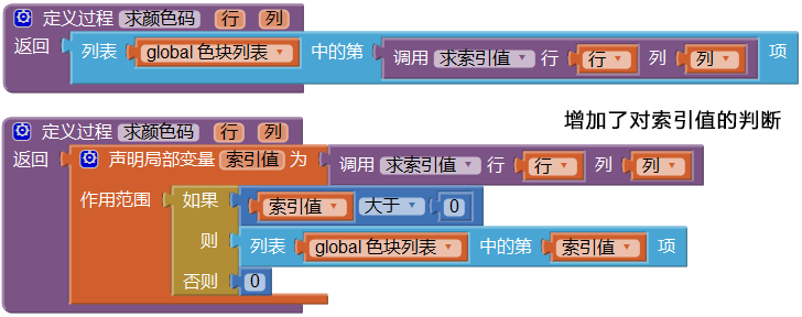 图12-15中的错误来自于触犯禁区过程,由于触犯禁区调用的求颜色码,而求颜色码调用了求索引值,于是,当试图旋转刚刚生成的2号组块时,发生了索引值<0的错误,因此我们需要改造求颜色码过程,如图12-16所示。其中,当索引值>0时,返回正确的颜色码,当索引值≤0时,返回0,这里的0与背景灰色方块的颜色码相同,表示画布顶部边界不会对旋转构成障碍。