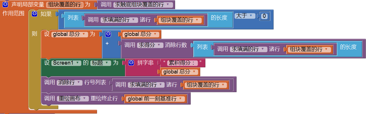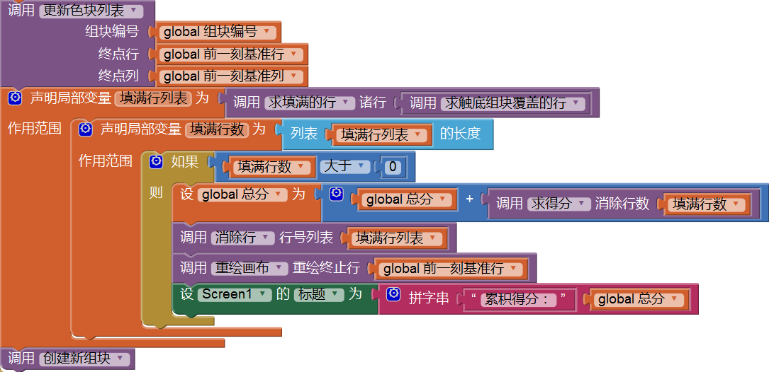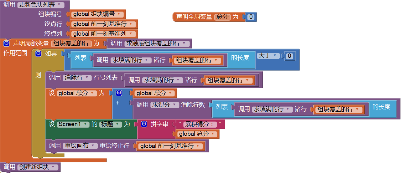 我们利用屏幕的标题来显示总分,经过在手机上的测试,得出的结果是,当一次性消除4行时,累计得分为0。哪里出了问题呢?回头看代码:累计得分的操作在“消除行”后面,此时,“色块列表”中的已经填满的行数已经为0,因此无从计算分数,修改代码顺序,将累计得分操作放在“消除行”之前,如图12-3所示,再测试,一次填满4行时,得分为100,测试通过,继续测试填满一样,分数累计结果也正确。