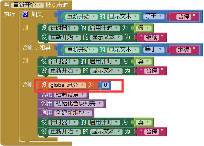 最后不要忘了一件重要的事情,就是在游戏重新开始时,重新将总分设为0,如图12-5所示。