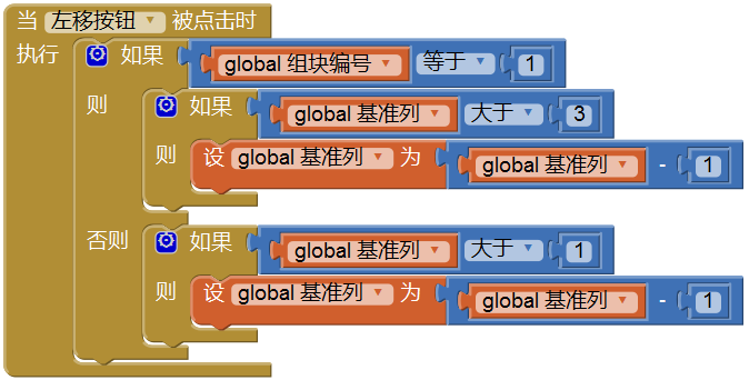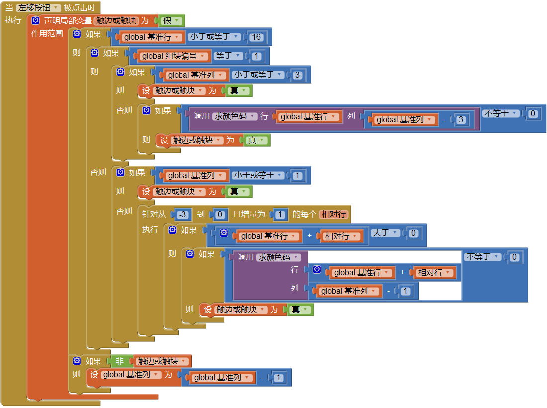 如果你随着本开发笔记的进度一边学习、一边实践的话,在测试过程中你会发现一些不合逻辑的现象,有些块已经触底,但后来的块在左右移动或快速下落时,竟然可以“穿墙而过”,覆盖掉这些块。这是因为此前对按钮点击事件的处理,只考虑到底部及左右边界对移动的限制,而没有把已经触底的组块考虑在内。现在我们就来解决这些问题,先来看左移动事件。如图12-6所示。