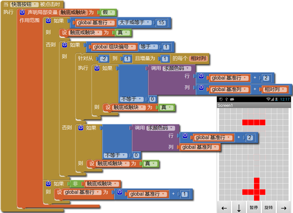 在测试中会发现点击快落按钮,会导致下落中的组块沉入已触底的组块中,但最多只会沉入一行,如图12-9的右图所示,这是因为对触块的判断会阻止快落组块的继续下落。解决这一问题的关键,是在快落事件中,对组块的下方的行进行判断,看其是否已经接触到了已经触底的组块。代码修改的结果如图12-9所示,注意我们对触底或触块的判断,在求颜色码时,使用的行数是(基准行+2),这是因为如果只考虑(基准行+1)行,那么在下一个计时周期中,组块的基准行还将+1,这样,无法避免后来的组块沉入已触底组块。