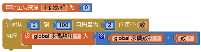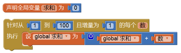 - 循环变量增量从1变为2; 我们还可以求从1到100的所有奇数的和,等等。有兴趣的同学可以自己在App Inventor中做一个小程序,将计算结果显示出来。
