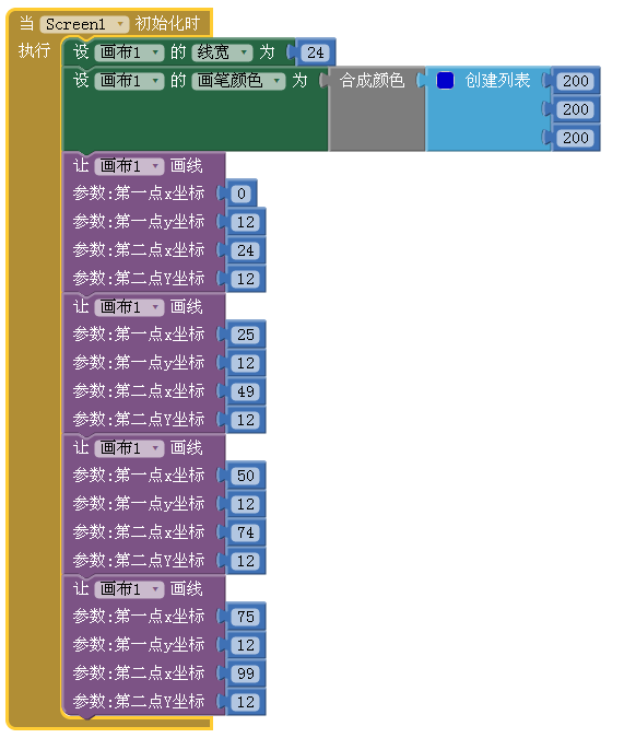显然,我们不可能调用192次画布的画线功能,App Inventor提供了重复执行类似命令的循环语句,它属于内置的控制类代码块(位居第二)。这是一个非常重要的语句块,在几乎所有程序中,都少不了循环语句的使用。下面我们用它来绘制第一行的方块。如图4-3所示。