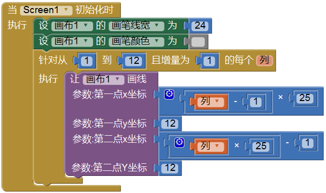 在上述代码块中,“针对从1到12且增量为1的每个列,执行...”块就是前面提到的循环语句,它包含了“让画布1画线”块。