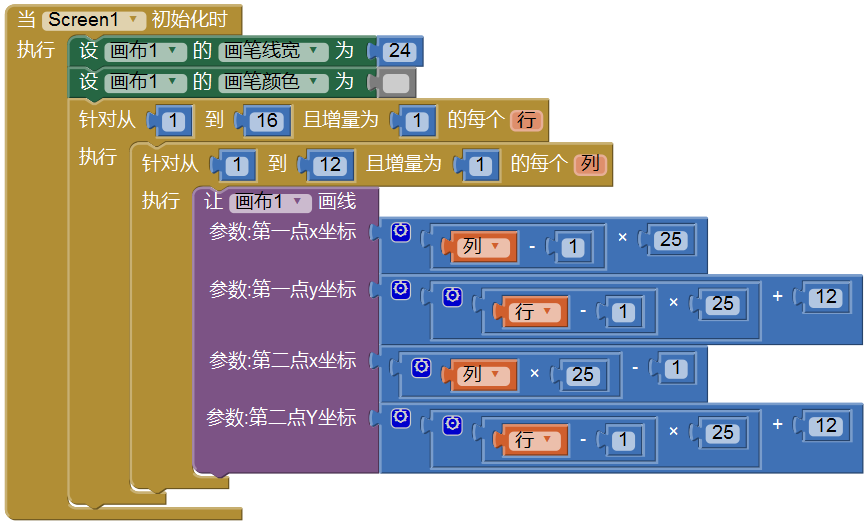 利用画布的画线功能及块语言的双重循环语句,我们已经成功地绘制了一个灰格方阵,这些灰色的格子是画布的背景,也是接下来我们开发的游戏的背景。
