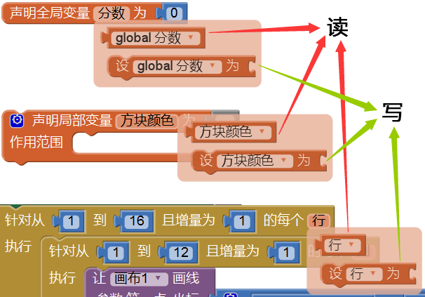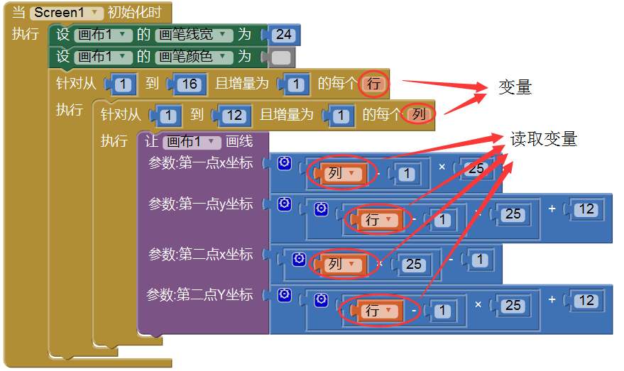 在图4-5,橙色区域中的文字就是变量的名字,它们的值分别代表了方块 所在的行和列,在程序的运行过程中,它们的值不断地被改变(+1),并被多次读取,用来计算在“画布1”上画线时的起点和终点位置。