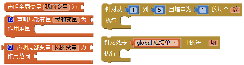 全局变量和局部变量都是独立变量,在使用之前需要进行显式声明,App Inventor分别提供了三种代码块,用来显式地声明全局变量和局部变量,如图4-6所示。而附属变量是某些代码块自带的变量,如上一节中我们用到的“行”、“列”,它们附属于循环语句,使用前无需显式声明,由App Inventor自动声明,并且只在循环语句内有效。