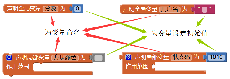 独立变量——全局变量及局部变量,在使用前必须进行显式地声明,声明的目的是为变量取名,同时为变量设定一个初始值,如图4-7所示。而附属变量在使用前无需显式声明,它的声明由App Inventor自动完成。