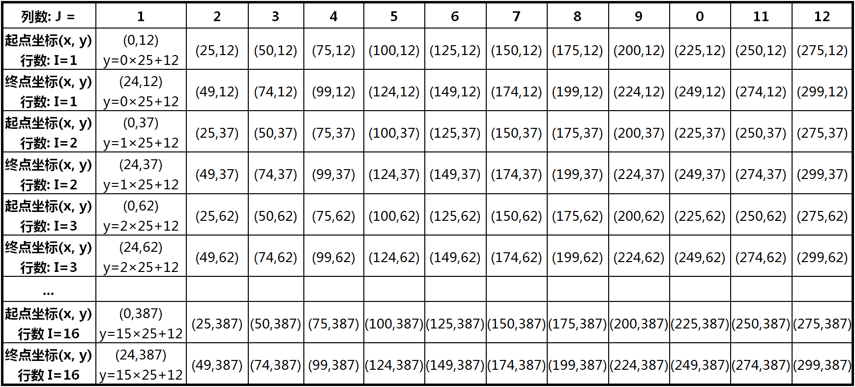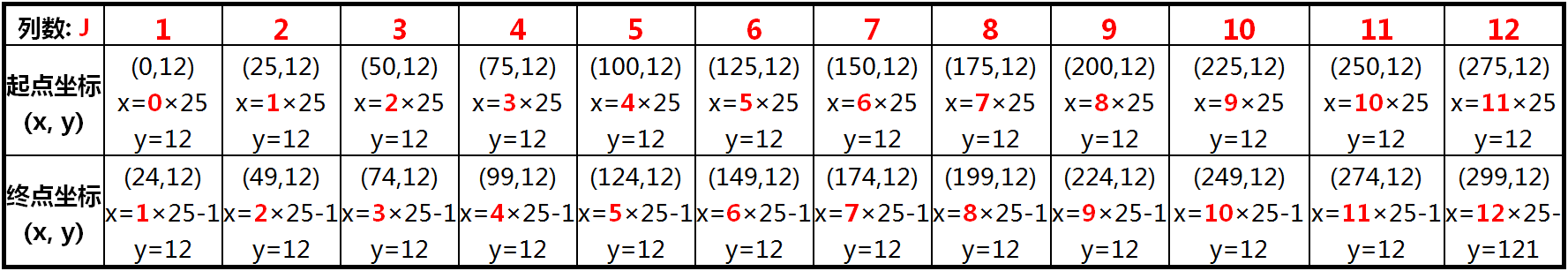 在上面表格中,无论是起点,还是终点,y的坐标值都等于12,但x的坐标值呈现出有规律的变化,即,相邻的两个块之间x坐标的差值为25,并且与列数有某种相关性。具体来说,如果用J来表示列数,则第J列起点及终点的x坐标值分别可以表示为: 起点x坐标 = (J-1)×25 终点x坐标 = J×25-1 以第7列为例,即当J=7时,起点的x坐标=(7-1)×25=150,终点的x坐标=7×25-1=174。