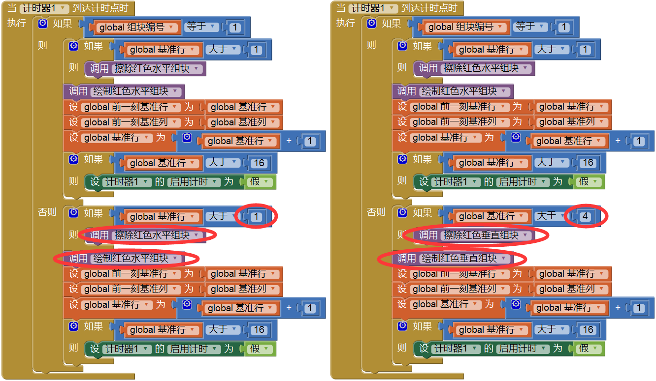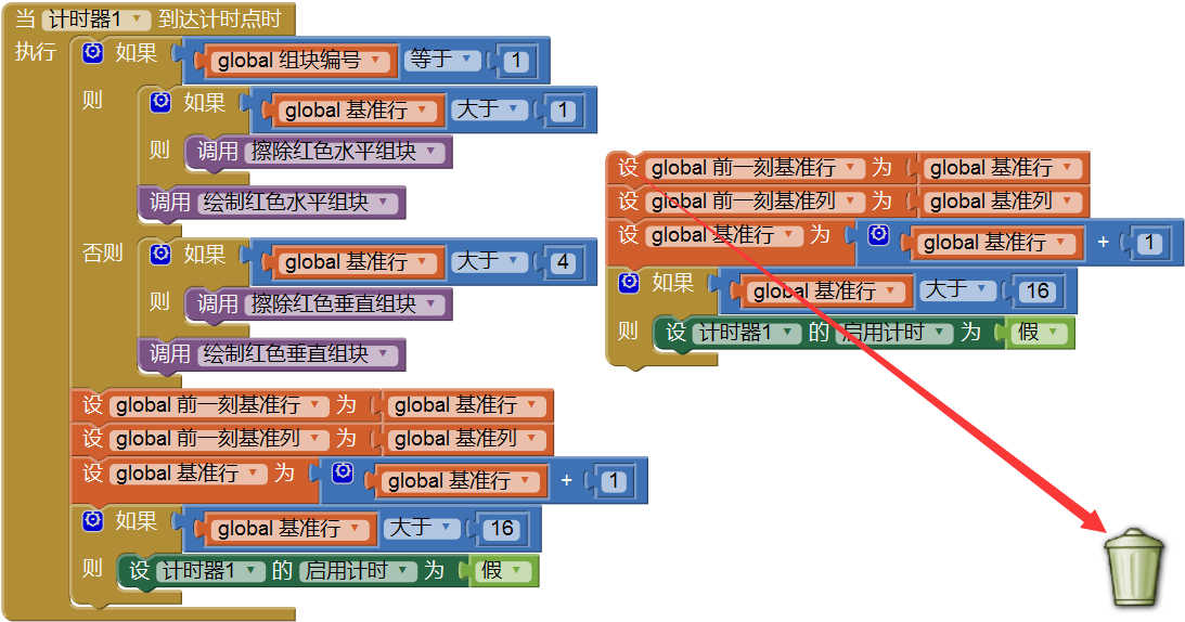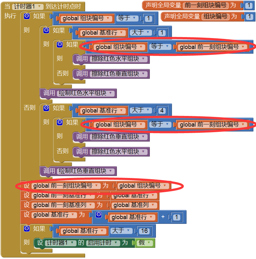 - 擦除红色水平组块:根据前一刻基准行、前一刻基准列的值擦除1号组块;