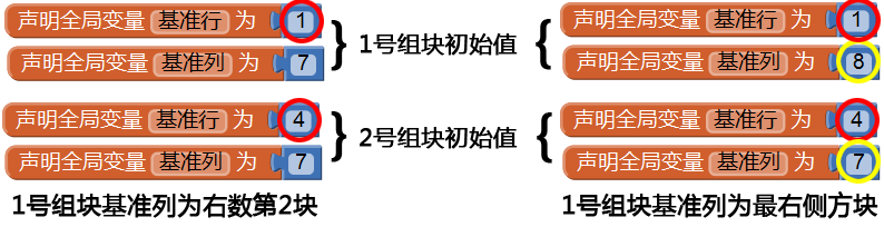 你可以思考一下,是否可以将组块的基准列设置为组块最左侧或最右侧的列,从而减少因组块编号的变化而带来的代码修改量呢?这里我们尝试将1号组块中最右边的方块设置为基准列,并与现在基准列设置进行比较,看看哪种策略代码的修改量更小。如图7-13所示。