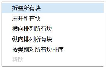此外,还可以对所有代码进行一次性的折叠与展开,对所有代码块进行统一的排列:横向排列、纵向排列或按类别排列。如图7-17所示。方法是在操作区的空白处点击鼠标右键,就会弹出图中的菜单。当程序中代码块过多时,这些功能有助于我们对代码的管理和查阅。