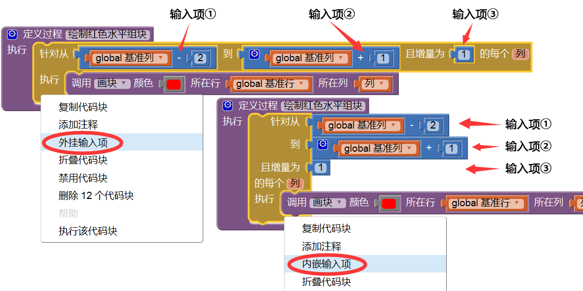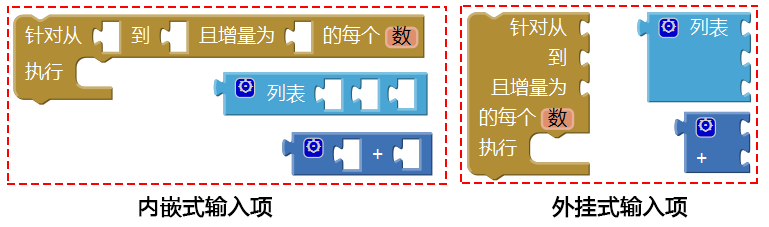 2、外挂与内嵌:如图7-19所示,输入项可以有两种显示方式,内嵌式与外挂式。其中内嵌式将输入项沿水平方向排列,并嵌入在代码块的内部;外挂式则让输入项在垂直方向排列,并呈现为若干个开放的插槽。这两种排列方式只是为了显示的方便,比如有些内嵌式的块有多个输入项,在屏幕上显得过宽,不利于代码的查看及维护,这是就可以将其修改为外挂式,将输入项纵向排列起来。
