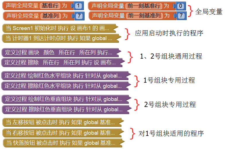 首先我们要声明一个全局变量“组块编号”,来保存当前时刻正在屏幕上自由下落的组块类型,所有的事件处理程序都将依据这个变量来确定具体执行哪一段程序。