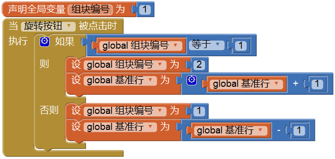在旋转事件处理程序中,我们为条件语句添加了一个“否则”的分支:当满足“组块编号=1”的条件时,执行“则”之后的代码;当不满足条件时,执行“否则”之后的代码。