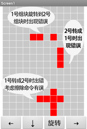 我们来测试一下修改过的代码,测试的结果如图7-8所示,当1号组块旋转为2号组块时,1号组块并没有被完整擦除;同样,当2号组块旋转为1号组块时,屏幕上依然残留着一部分2号组块。这不是我们想要的结果,我们需要对代码进行检查,找出问题的所在。可以断定的是,问题与组块的擦除操作有关。