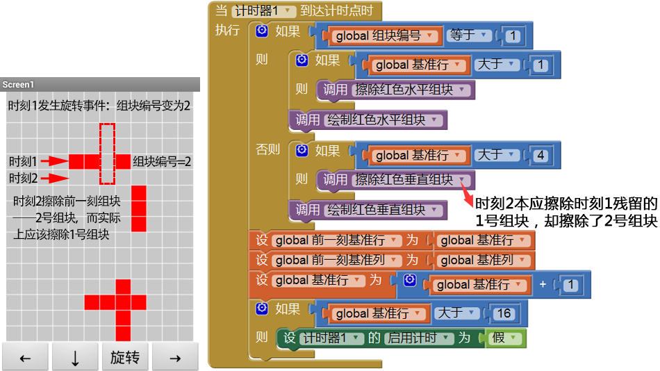 如图7-9所示,时刻1发生了旋转事件,组块编号从1变为2,而屏幕上遗留的是1号组块;时刻2,由于组块编号等于2,因此将执行计时事件中的“否则”分支,即,先擦除2号组块,再绘制新的2号组块。这样做的结果,就是屏幕上的待擦除的1号组块仅仅被擦掉了与2号组块重叠的那个方块,而其余三个方块就留在了屏幕上。同样的事情也发生在由2号组块旋转为1号组块的过程中。也就是说,当前时刻,程序并不知道前一时刻的组块编号,因此擦除操作才出现错误。解决的办法是声明一个全局变量前一刻组块编号,并在擦除操作前进行判断,根据前一刻组块编号,来决定调用哪一个擦除过程。修改后的代码如图7-10所示。