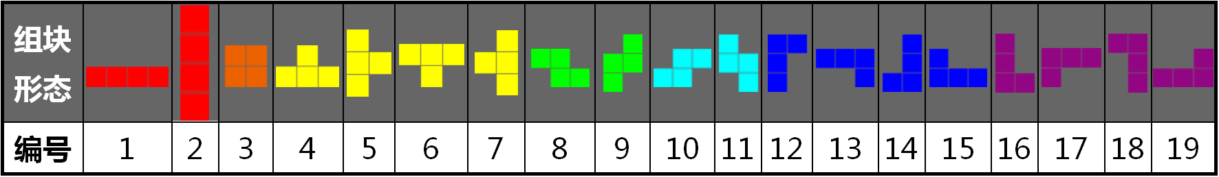 我们需要为所有的可能形态(形状和方向)设置一个编号,如表7-1。表中的第一行是组块可能处于的19种形态,第二行是与组块形态对应的组块编号。